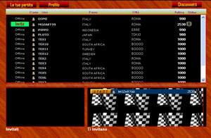 Nella prima finestra in alto appaiono i giocatori collegati. Quando si evidenzia il pulsante luminoso puoi cliccare per sfidare un giocatore.